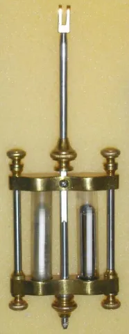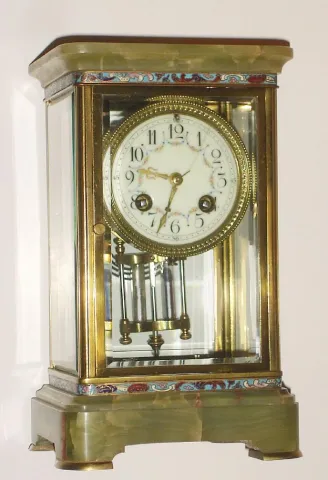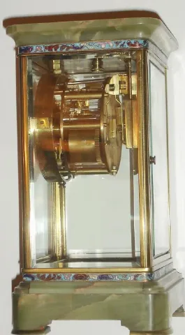 French, brass and glass 'Crystal' regulator, with green onyx top and base, and with bands bearing enamel inlay both top and bottom, and with a 2-vial compensating pendulum (intact).