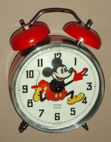 Mickey Mouse mechanical alarm clock automaton with Mickey's hands indicating the hours and minutes and his head ticking, licensed by Walt Disney Productions copyright 1977 Made in France and new old stock, c1977