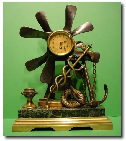 An industrial timepiece propeller blade clock with ships capstan containing a compass, gilded lifebelt, apothec and anchor. An 8-day cylinder escapement timepiece French movement, gilded dial with black roman numerals and fleurs-de-lis hands. Circa 1900.The green girote marble base is in very good condition. 13.5" x 9.5" x 5"