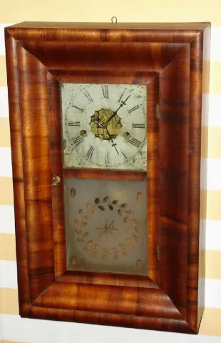 well figured mahogany veneered case is in clean condition in an old finish with a small repair on the half round molding on the right side, and other ...