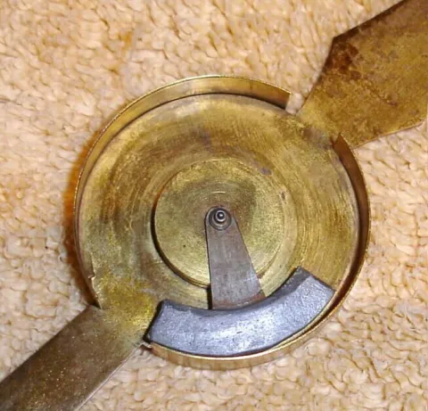 French, Early 20th Century, MYSTERIOUS timepiece, two gilt hands attached to a large glass dial. A Swiss watch movement in each hand, one geared to turn once an hour, the other designed to turn once in 12 hours. See detail fotos of movement and also pivot