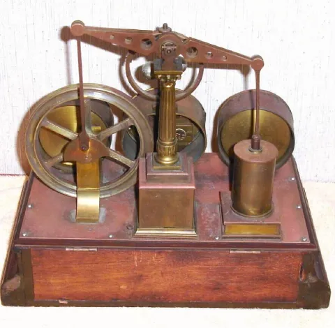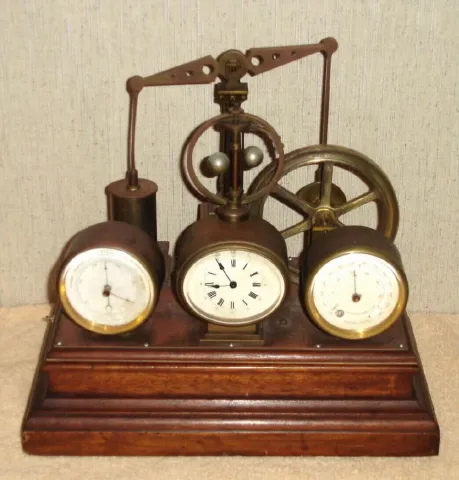 French, Clock / Automaton with Barometer and Thermometer, C.1880. This is a well made and interesting piece, wound through the bottom, and actuated with a pull to the left side which allows the "steam pump" to run for a few minutes, one revolution of the