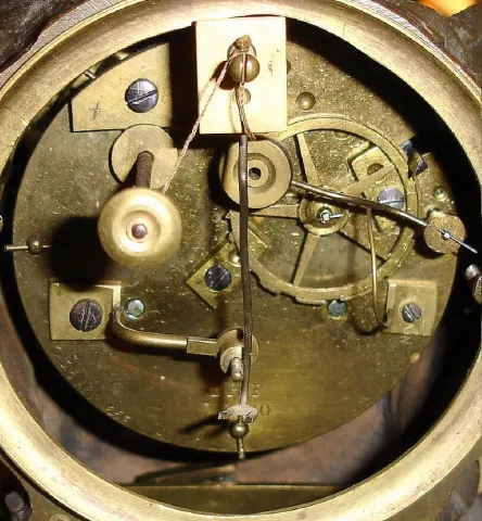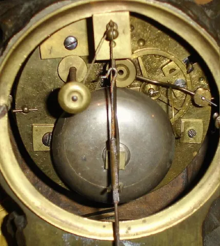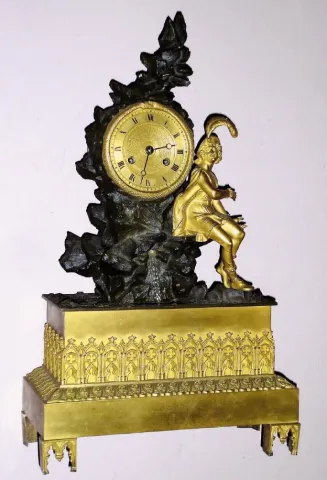 French gilded brass figural waterfall automaton mantel clock with 8 day time and bell strike silk thread suspension spring driven movement with troubadour seated atop bronze rocky outcropping with crystal "waterfall / fountain" turning as clock ticks givi