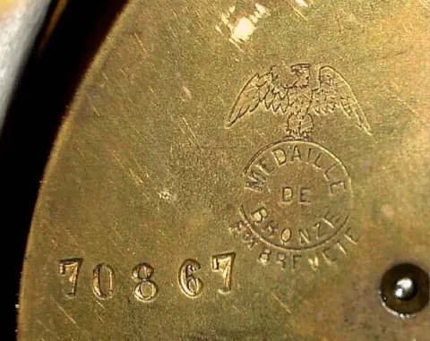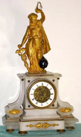 French gilt figural mantel clock with conical pendulum 8 day time and strike spring driven movement in soft white marble case surmounted by Greek figure holding pendulum, possibly Hygieia the goddess of good health, bearing a serpent entwined staff with R