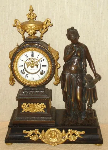 Ansonia Clock Co., New York, C.1880, "POETRY" figure clock, bronze patinated spelter statue and clock tower on a black iron base, with gilt ornaments. Open escapement on porcelain dial.