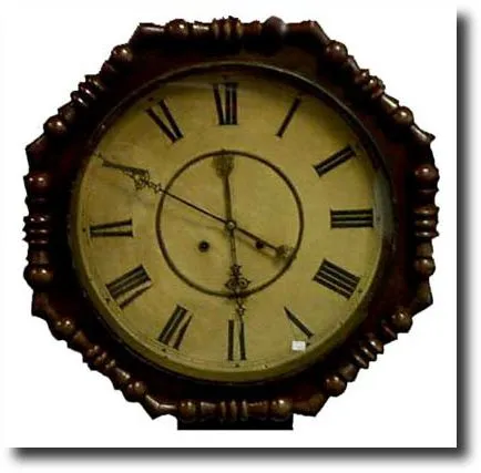 Eight day movement with unusual dual hourly bell strikes that count the hours. Very large 15 inch dial. Dimensions: 18"h x 18"w x 5"d.