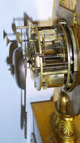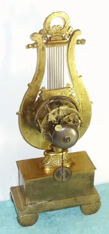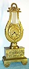 French, Lyre Form mantel clock, c.1830, silk thread suspension, in an ormolu lyre frame with gilt brass base. The mov't with rear adjust for F/S. Gilt dial with painted Roman numerals.