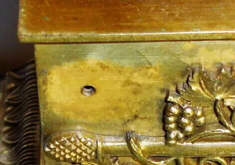 part of the floral trim [left leaf+grapes] is now absent from the base; perhaps you can copy what is on the other side. Mov't has been cleaned, but is...