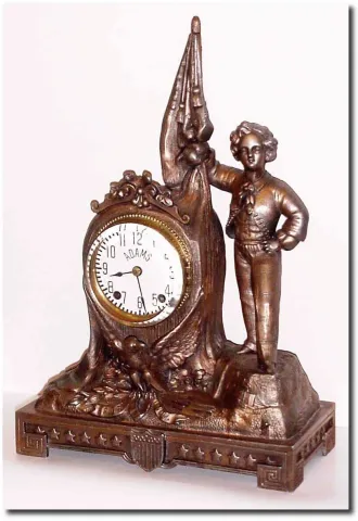 Neither Chris nor I can find an example of this clock, a likely war commemorative. A lad of maybe 12, wearing plaid pants, is standing holding an American Flag; the large flag draped around the clock (the stripes cast into the metal). Below the clock rests a spread eagle and the motto: E PLURIBUS UNUM. The rectangular base with 30 stars; the whole refinished with rub"n buff(. The unusual round movement is original to the case and has count wheel striking, on a bell. The dial appears to have been milled out recently on a digital control machine. Clean and running; height 15'