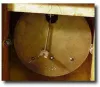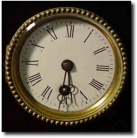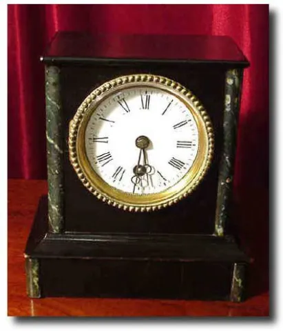 A very small faux marble mantle clock with a German timepiece movement. Lacquered wooden case, enamel dial, green faux marble pillars and heavy cast brass bezel fitted with beveled glass. Nice quality and condition - movement clean and running. Height 7 3/4", depth 4", width 6 3/4" (Note: shipping to United States $25.00) Additional keywords: black mantel, mantle, shelf