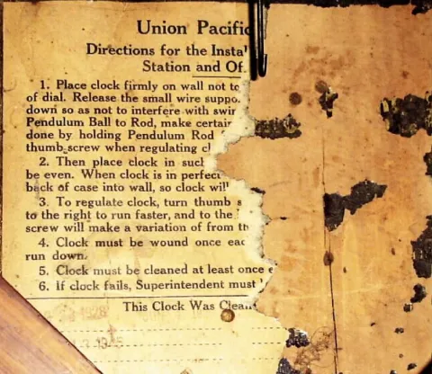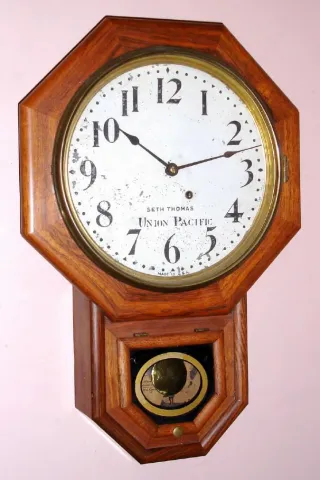 Seth Thomas Clock Co, C.1891 {dated on rear}, 12 short drop octagon, made under contract for Union Pacific Railway. Note the dial is signed Union Pacific, the label [40% missing] is special for Union Pacific, and the rear of the case is also stenciled "Un