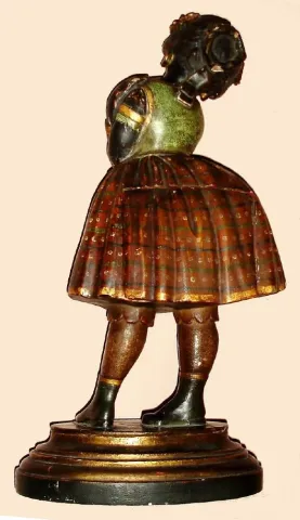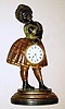 Topsey carved wooden mantel clock with French 8 day time only mov't with platform cylinder escapement in ebonized and polychrome painted case with Roman numeral porcelain dial inset into Topsey's dress, c1875