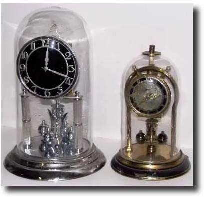 (lot of 2) C.1953, German, 1> Schatz mini 400-Day "Anniversary" clock with black enamel trim (with some chips and wear), and with original 3-ball pendulum - lower susp block is missing; fork intact. Original dome with hole in top for retainer (ring handle lacking) And 2> a Kern and Sons, 400-Day, in chrome, with neat overlay Art Deco dial mask. Suspension spring and fork are missing, but clock is otherwise complete and sound. Note retains original heavy glass dome; clock is dirty. 9" and 12" One bid for both: $40-60
