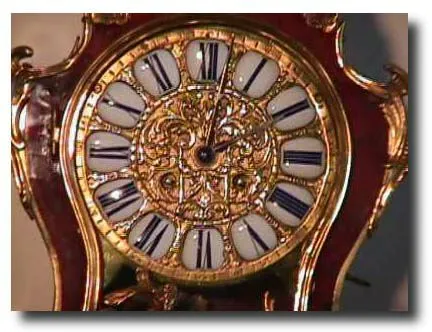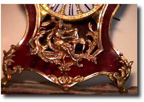 French clocks of this period have not survived in any great numbers due to two world wars. The height on this clock is 18" and 5 1/2" deep. The clockworks is of week duration and stikes the hour and half on a silver bell. The dial is made of gilt bronze with 12 applied porcelain cartouches with cobalt blue numerals. The entire case is veneered with red tortoiseshell both inside and out, excluding the back. All of the gilt bronze adornments are original. One minor repair at the very top decoration would not be noticable unless it was mentioned. The pendulum is the traditional Louis XIV sun burst. On the sides of the clock are glass viewing panels, surrounded by gilt bronze roping. There is a little color loss of the red tortoiseshell on the right side due to sun bleaching; however the tortoiseshell is not damaged. Bear is mind that this is not an Italian reproduction. This clock is completely original and one of the most pristine I have owned. The clock runs and keeps accurate time and has just been fully restored. At a show you could expect to pay $4500+ and possibly not in as good condition as this. (Dealer's comments)