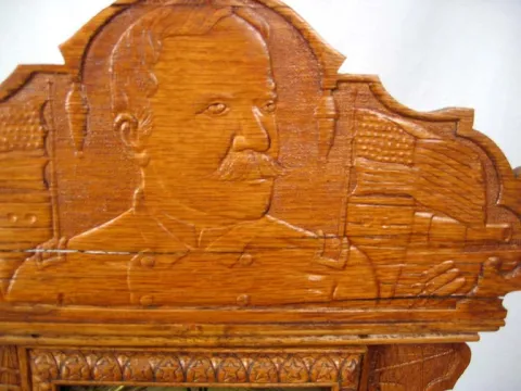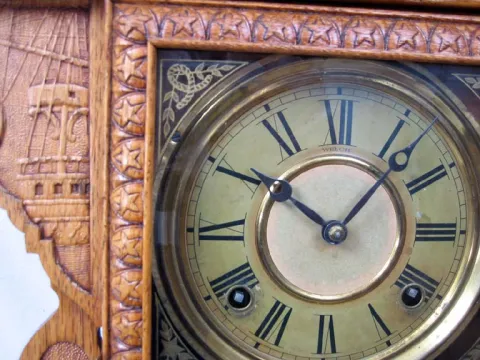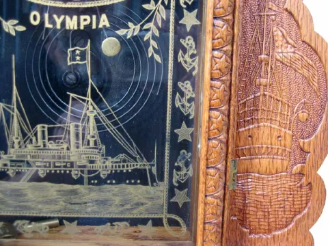 Refinished solid oak case in excellent condition. Pressed design of Dewey at the top with battleships at the sides, stars and anchors on the base and ...