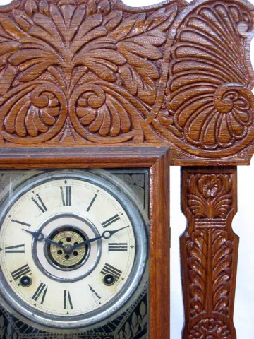 This case has been refinished and the finish is rather heavy and shiny. The back of the clock is painted white. It has a good original dial and origin...