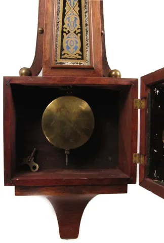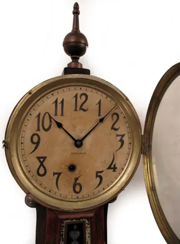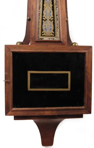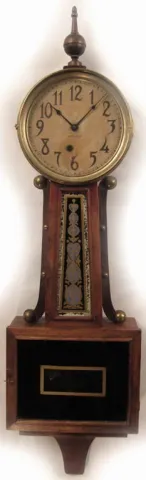 This mahogany case has been nicely refinished and is lighter in color because of that. Both reverse painted glasses are original. The throat glass has...