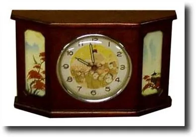Mao Revolutionary Clock This clock was manufactured in China during the cultural revolution, with very many political overtones. It has pictured in the center of the dial students who are moving their hands with the Mao Little Red Book, the Bible of the Maoists of the time. It is a mahogany wooden case and has a nice mechanical movement. Dimensions: 5"h x 9"w x 3"d. Additional keywords: table, mantel, mantle