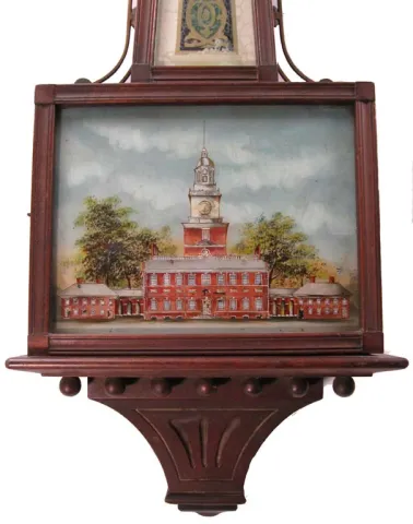 Mahogany case in the original finish which is dusty but has no damages. Presentation base plus brass sidearms and eagle finial. The silvered dial show...