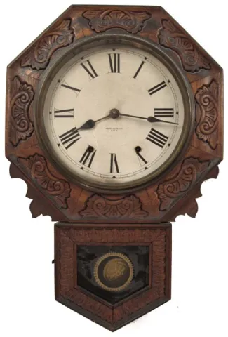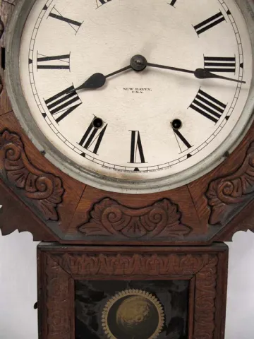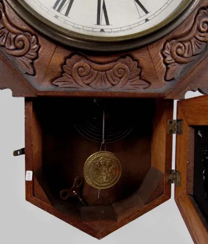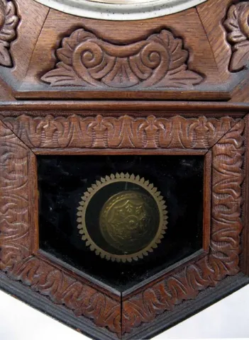 Solid oak case with interesting deep pressed designs in the dark original finish. Some simple cleaning would lighten it up considerably. The reverse d...
