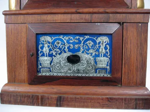 The mahogany and rosewood case could use a better coat of finish but the veneer is in very good condition. The quarter columns have been repainted gol...