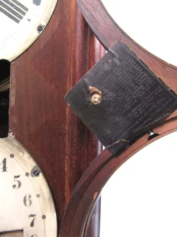 This clock has a nicely refinished solid walnut case with just two small veneer chips on the back edge. Both painted dials are original. The upper has...
