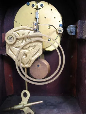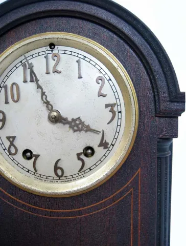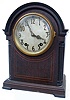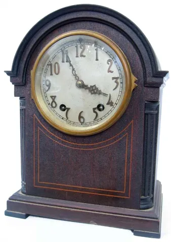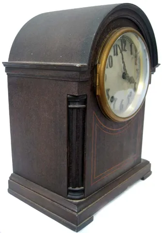 Solid mahogany case in a dusty original finish which would benefit from a cleaning. It has reeded columns at the corners and satinwood inlay in front....