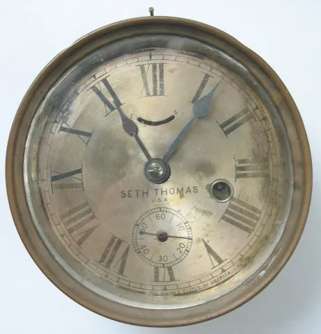 This has an unpolished sheet brass case with a bayonet style of bezel mounting. The silvered dial and seconds have discoloration but the numerals are ...