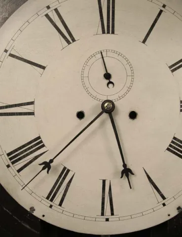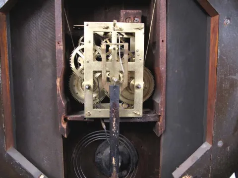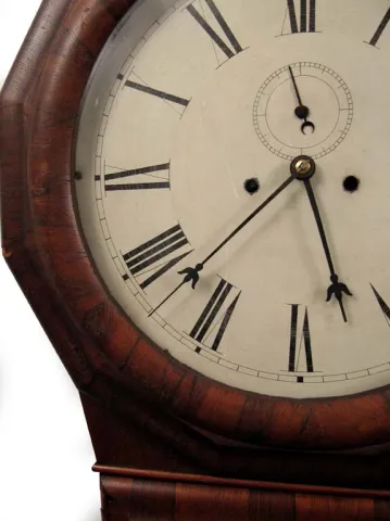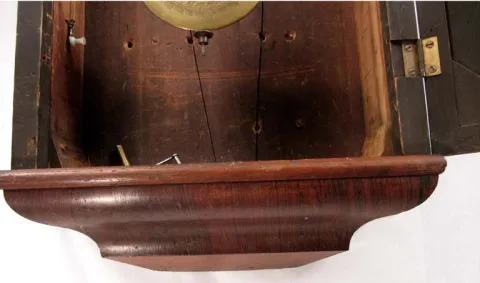 This clock has a rosewood case in the original finish. It is missing numerous veneer pieces, mainly on the outer edges. The gold leaf Regulator glass ...