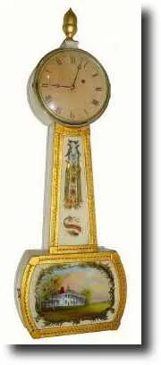 Mixed banjo lot:, a C.1855 banjo movement, now in a C.1920 case, painted gray and with new rope front throat and door. Bezel latch is broken. It has a great $200 set of Mt. Vernon tablets, and is cosmetically attractive. Use as parts or enjoy as-is. Height 34" $400-600