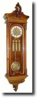 on which the case back and sides are old, but the bottom, top and door have been newly made in Hungary after the Baroque style. Moreover, it has a good Viennese movement, which has been married to a nice embossed Becker dial with matched embossing on weights and pendulum. This is a GOOD looking clock, and seems to run and strike OK (could stand service), and we have it in this position in the sale to appeal to the person who could not afford a 100 percent antique Baroque clock, which seem to bring over $2500. Height 51 inches $1000-1500