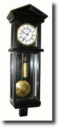 Mixed lot: An old Vienna movement now in a new home made ebonized case of "Latern" style. The case design and finish is primitive, solid wood with no veneer and simple black finish. Top and center panels are mounted as doors with brass gate hinges. Movement is clean and running; will need adjusting. These are more of a decorator clock at this point; approx 3 ft. $200-300