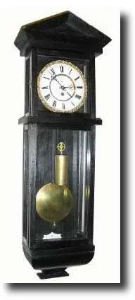 Mixed lot: An old Vienna movement now in a new home made ebonized case of "Latern" style. The case design and finish is primitive, solid wood with no veneer and simple black finish. Top and center panels are mounted as doors with brass gate hinges. Movement is clean and running; will need adjusting; needs longer suspension spring. The dial with repairs and lacquered over; cast bezel; hands are new; height approx 3 ft. $175-275