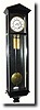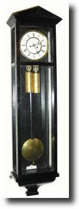 now in a new home made ebonized case of "Dachluhr" style. The case design and finish is primitive, solid wood with no veneer and simple black finish. Top and center panels are mounted as doors with brass gate hinges. Movement is clean and running. This is an unusual long drop 2-weight movement. The clock won a 2nd place ribbon in the '96 New Mexico State Fair that is included; battery clock hands are loose on the movement; weights are a bit too large and rub against each other; height approx 3 feet. $200-300