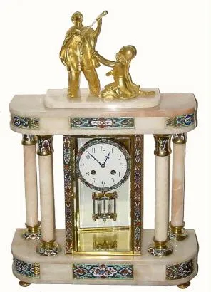 The wonderfully finished metal case is 7.5" high, good castings of rural man and woman. Beveled glass, celluloid dial, original hands, backwind and se...