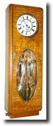 now in a C.1920 Deco style case with burled ash veneer on the door. Although this clock runs, it has lots of aesthetic problemsÖ..a home made bracket that is quite remedial; chunk of porcelain missing from the dial and touched up with wrong shade paint. Worm holes in the back board; one pane of bevel glass with chip. Still a lot of clock for the money. Height 33" $225-325