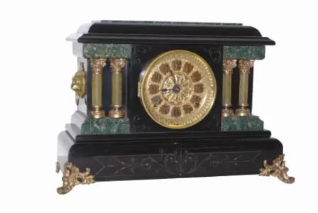 Seth Thomas Clock Co. adamantine finished case is black with green marbleized moldings around each end and the top layer of adamantine is green.