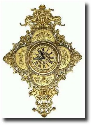 with fine detail, showing cherubs, angels and dancers, now with a C.1950 German fit-up movement. This is a large and impressive wall piece and would not have had an elaborate movement to begin with, and the replacement is adequate. If you have a spot that requires a lot of gold, maybe this is for you. Height 29" Reserve $500