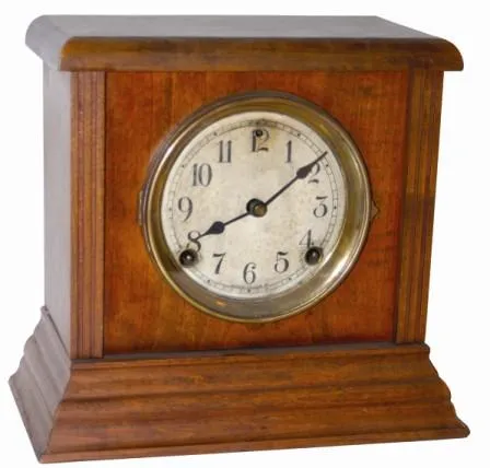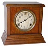 Oak case is 10" tall and 11" wide, complete and original. Finish needs a boost, looks dry. I believe everything is original to the clock, with the pos...