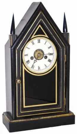Very nice inside and out, complete label says, "Superior / One Day / Black And Gold / Gothic Timepiece / Alarm / Trade Mark / Atlantic Clock Company /...