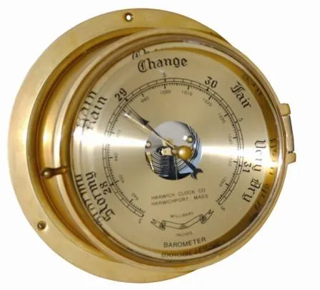 Brass barometer in a large brass case, with a heavily beveled glass over a silver dial. The case is 8" across the back, 6" across the top.