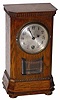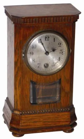 German miniature desk clock. A super little clock, only 8" high, ripple trim around the top and bottom, four wood bun feet, edges angled around the corners, and a full hinged and latching wood back door.