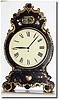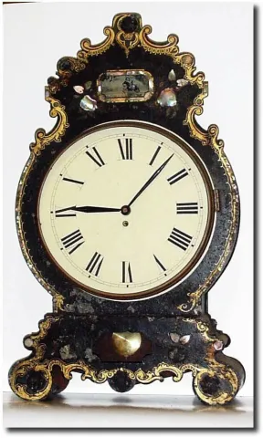 But the best part is that the case was designed with a "rocking horse' in the arch, beating in sync with the pendulum swinging in the orifice below. A handy clockmaker might reinstall an American movement and have an interesting clock indeed. Glass and couple bits of MOP are missing; height 28'. Our estimate is a guess: