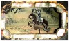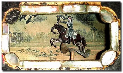 Mixed lot: This is C.1850 stenciled tin case with MOP, now with a small German fit-up movement, and repainted dial. But the best part is that the case was designed with a "rocking horse' in the arch, beating in sync with the pendulum swinging in the orifice below. A handy clockmaker might reinstall an American movement and have an interesting clock indeed. Glass and couple bits of MOP are missing; height 28'. Our estimate is a guess: