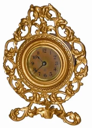 Originally finished in rich gold. It is still gold but repainted. The case is 9.5" high, 7" wide, and is complete. Flat glass over the paper dial, ori...