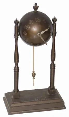 Metal stand with a 3" brass ball, stamped numbers on the front and curved hands. It is 9.5" high, complete, fitted with a Lux 30 hour pendulum movemen...