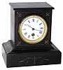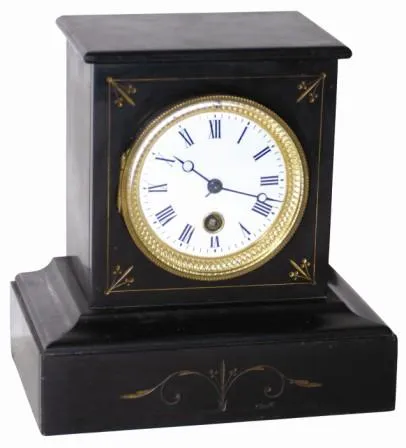 French miniature slate clock, only 8" tall. It may be small, but it is heavy, well made, and has the best of accessories, i.e. movement, dial, etc.