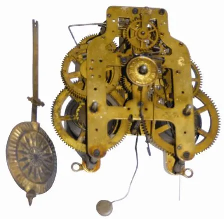 Seth Thomas 8 day brass movement, time, strike, and simple calendar. Brass pendulum bob and brass hanger.