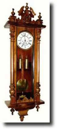 with earlier movement from another clock, as-found. This clock looks quite good in the photo, but is very dirty and needs the attention of a clockmaker. When they drilled the movement to fit the rear mount bracket, they left only the holes in the bottom pillars for attaching the cord. And the clock must have belonged to a person with vision impairment, as we have never seen so many scratches around the winding holes on a porcelain dial (no cracks, just wore the glaze coat). This case was made C.1920 by a Swiss cabinet maker to match a set of furniture, and is well made but slightly different dimensions than a factory job. Old weights with poor home-made hooks. Amazingly ticks and strikes. Height 50 inches Movement is worth estimate $275-375