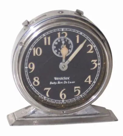 Westclox "Baby Ben" alarm clock, 3" high. Nickel case is bright and clean, complete with all its knobs and dials.